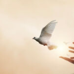 Praying hands and white dove flying happily on blurred background with sunset , hope and freedom concept.